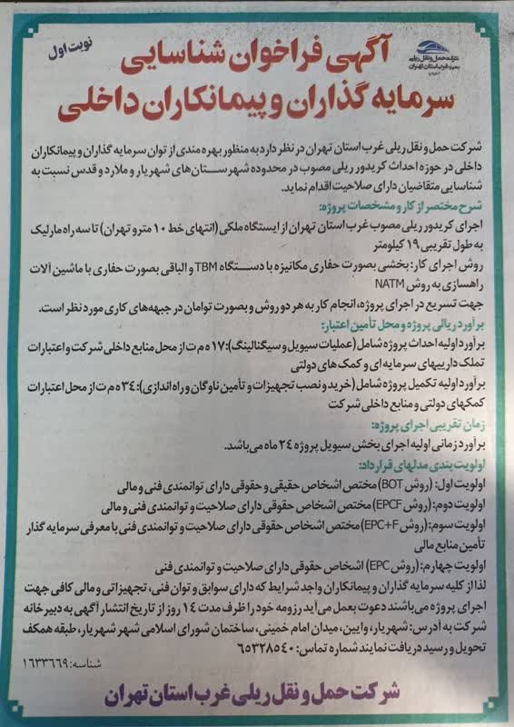 شرکت حمل و نقل ریلی غرب استان تهران در نظر دارد به منظور بهره مندی از توان سرمایه گذاران و پیمانکاران داخلی در حوزه احداث کریدور ریلی مصوب در محدوده شهرستانهای شهریار و ملارد و قدس نسبت به شناسایی متقاضیان دارای صلاحیت اقدام نماید.