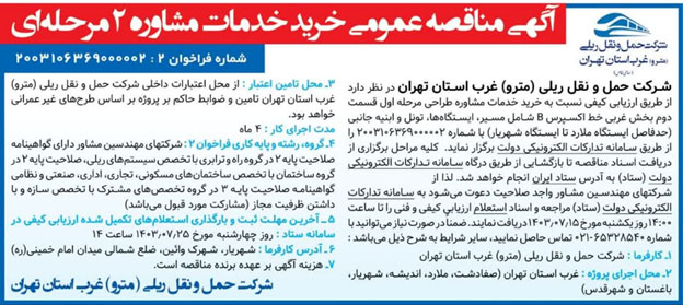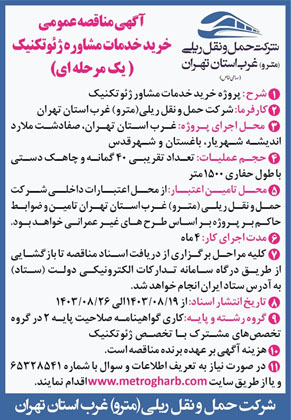 کارفرما: شرکت حمل و نقل ریلی(مترو) غرب استان تهران